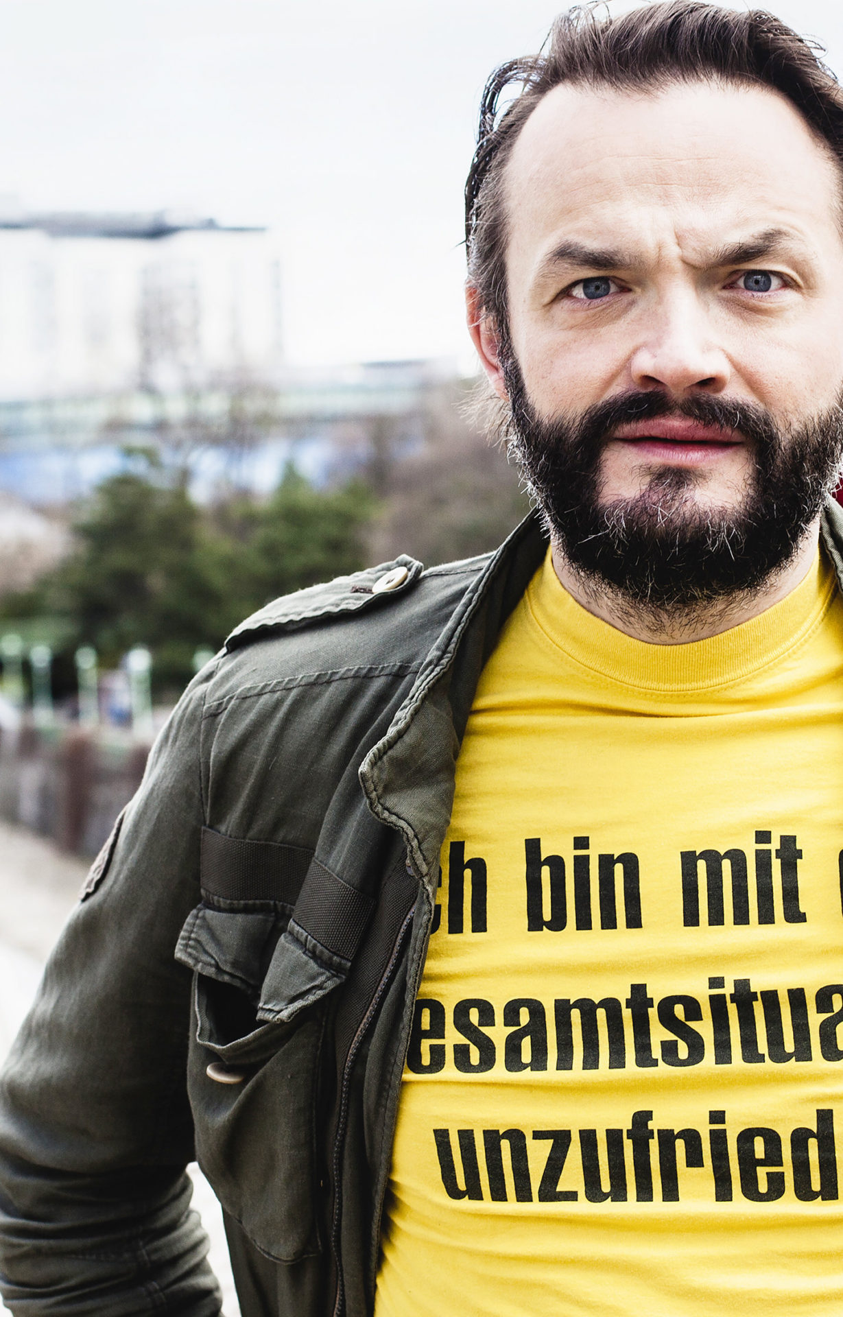 Und hier kommt erneut ein Satz, der für die Schmelzer’sche Reſlexion typisch erscheint: „Wenn man sich in der reinen Überhöhung gefällt, ist es Gaukelei. Aber wenn man sie mit von innen kommenden Konflikten füllt, kann Satire richtig Spaß machen.“ Er jedenfalls versuche, „nicht auch noch lustig dreinzuschauen oder einen funky Move zu machen, sondern mich auf die Not der Figur zu konzentrieren“.